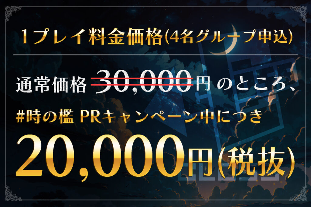 標準料金 30,000円(税抜/4名グループ申込の場合)→時の檻 PRキャンペーン中につき、20,000円(税抜/4名グループ申込の場合)